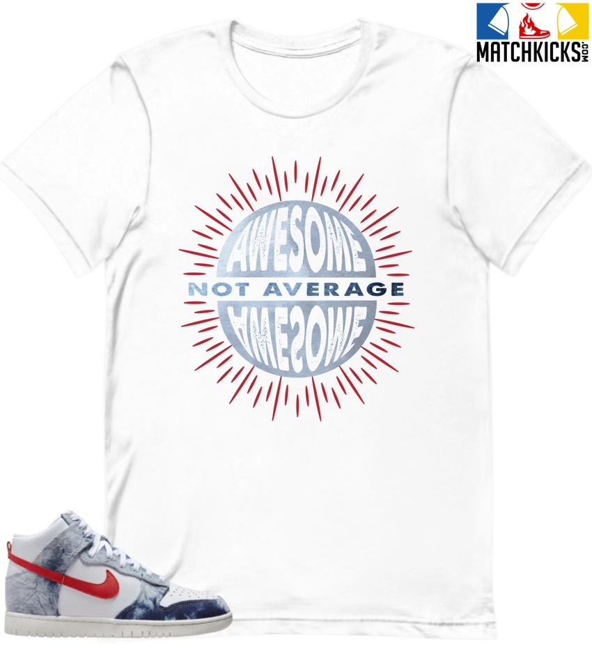 T-Shirt – Nike Dunk High Washed Denim Pack – Sneaker-Matching T-Shirt (Awesome Not Average) is a high quality sneaker-matching T-Shirt designed to match your Nike Dunk High Washed Denim Pack sneakers. – This Tee is designed with the exact colors to match with a premium look and feel. We only use the best materials and inks to produce our merchandise. All sizes are true to size.