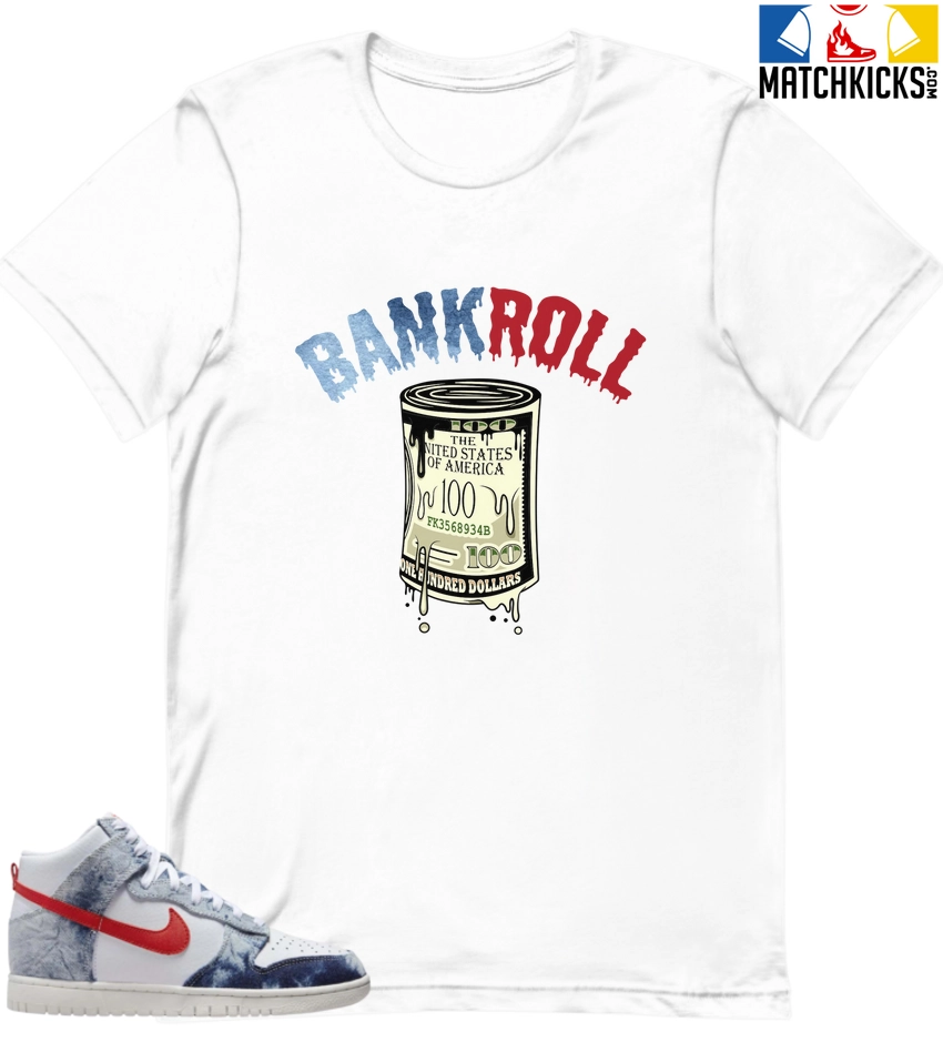 T-Shirt – Nike Dunk High Washed Denim Pack – Sneaker-Matching T-Shirt (BANKROLL) is a high quality sneaker-matching T-Shirt designed to match your Nike Dunk High Washed Denim Pack sneakers. – This Tee is designed with the exact colors to match with a premium look and feel. We only use the best materials and inks to produce our merchandise. All sizes are true to size.