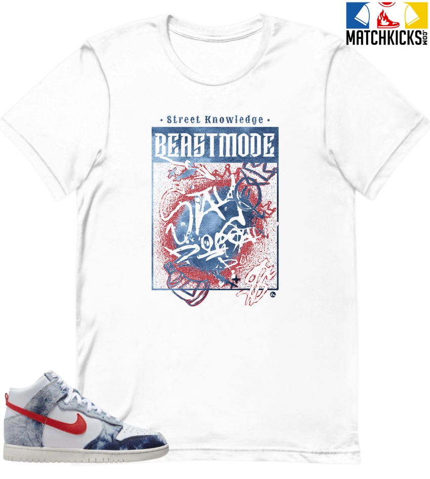 T-Shirt – Nike Dunk High Washed Denim Pack – Sneaker-Matching T-Shirt (BEAST MODE) is a high quality sneaker-matching T-Shirt designed to match your Nike Dunk High Washed Denim Pack sneakers. – This Tee is designed with the exact colors to match with a premium look and feel. We only use the best materials and inks to produce our merchandise. All sizes are true to size.