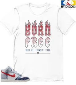 T-Shirt – Nike Dunk High Washed Denim Pack – Sneaker-Matching T-Shirt (Born Free) is a high quality sneaker-matching T-Shirt designed to match your Nike Dunk High Washed Denim Pack sneakers. – This Tee is designed with the exact colors to match with a premium look and feel. We only use the best materials and inks to produce our merchandise. All sizes are true to size.