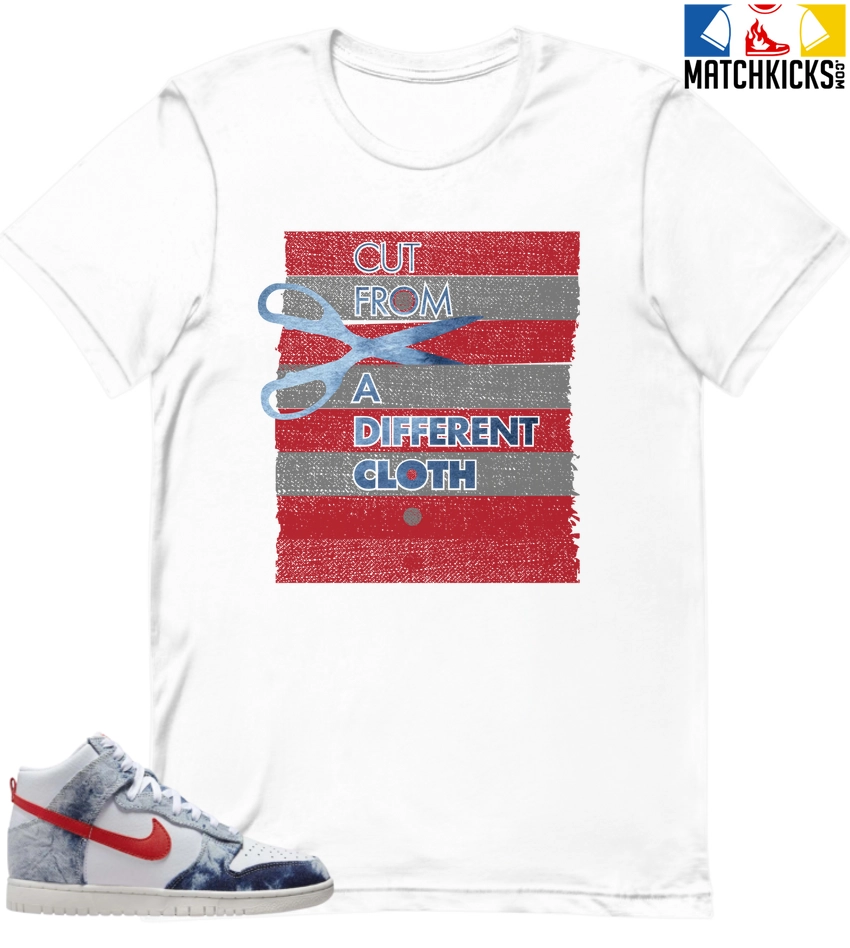 T-Shirt – Nike Dunk High Washed Denim Pack – Sneaker-Matching T-Shirt (Cut From a Different Cloth) is a high quality sneaker-matching T-Shirt designed to match your Nike Dunk High Washed Denim Pack sneakers. – This Tee is designed with the exact colors to match with a premium look and feel. We only use the best materials and inks to produce our merchandise. All sizes are true to size.
