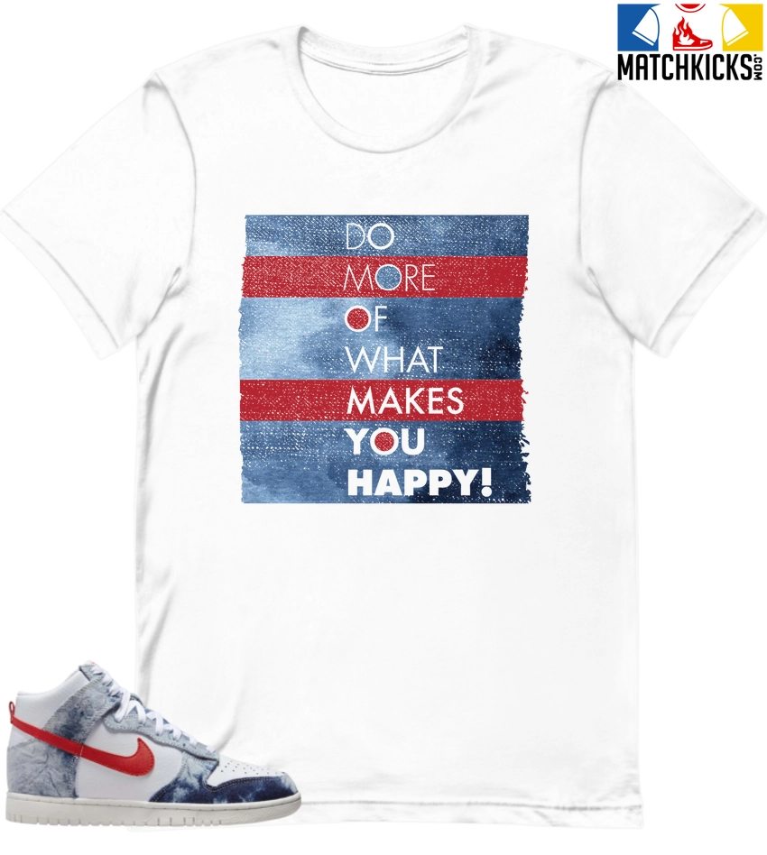 T-Shirt – Nike Dunk High Washed Denim Pack – Sneaker-Matching T-Shirt (Do More of What Makes You Happy) is a high quality sneaker-matching T-Shirt designed to match your Nike Dunk High Washed Denim Pack sneakers. – This Tee is designed with the exact colors to match with a premium look and feel. We only use the best materials and inks to produce our merchandise. All sizes are true to size.