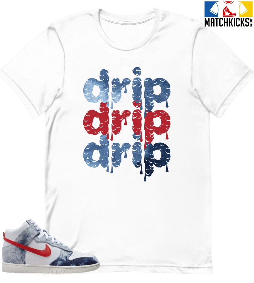T-Shirt – Nike Dunk High Washed Denim Pack – Sneaker-Matching T-Shirt (DRIP DRIP DRIP) is a high quality sneaker-matching T-Shirt designed to match your Nike Dunk High Washed Denim Pack sneakers. – This Tee is designed with the exact colors to match with a premium look and feel. We only use the best materials and inks to produce our merchandise. All sizes are true to size.