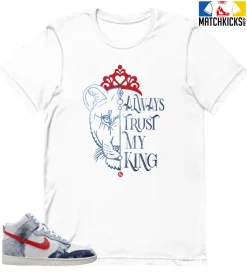 T-Shirt – Nike Dunk High Washed Denim Pack – Sneaker-Matching T-Shirt (FEMALE QUEEN) is a high quality sneaker-matching T-Shirt designed to match your Nike Dunk High Washed Denim Pack sneakers. – This Tee is designed with the exact colors to match with a premium look and feel. We only use the best materials and inks to produce our merchandise. All sizes are true to size.