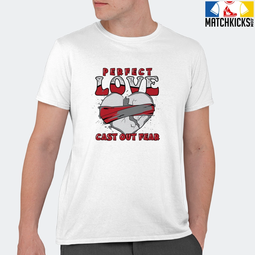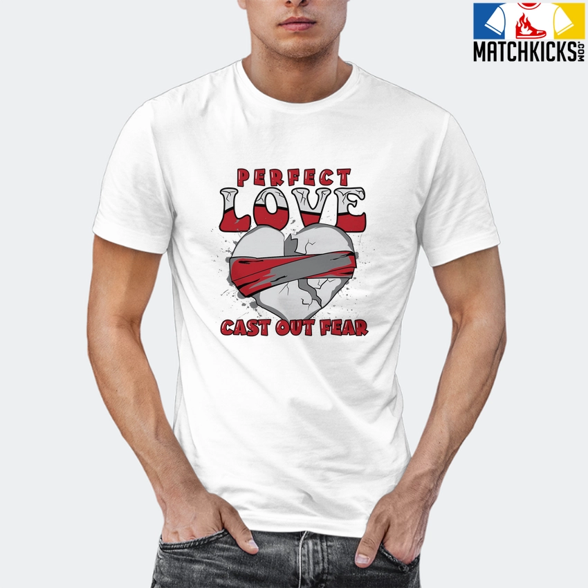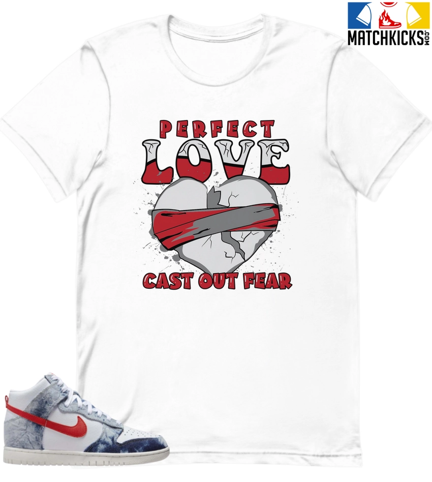 T-Shirt – Nike Dunk High Washed Denim Pack – Sneaker-Matching T-Shirt (Perfect Love Cast Out Fear) is a high quality sneaker-matching T-Shirt designed to match your Nike Dunk High Washed Denim Pack sneakers. – This Tee is designed with the exact colors to match with a premium look and feel. We only use the best materials and inks to produce our merchandise. All sizes are true to size.