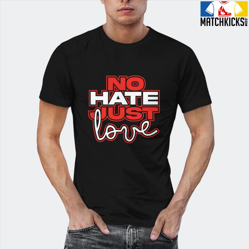 T-Shirt – Nike Dunk Low EMB NBA 75th Anniversary Chicago – Sneaker-Matching T-Shirt (No Hate Just Love) is a high quality sneaker-matching T-Shirt designed to match your Nike Dunk Low EMB NBA 75th Anniversary Chicago sneakers. – This Tee is designed with the exact colors to match with a premium look and feel. We only use the best materials and inks to produce our merchandise. All sizes are true to size.