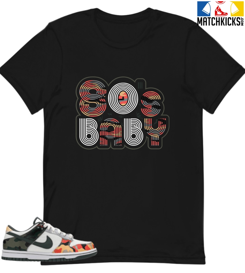 T-Shirt – Nike Dunk Low SE GS Sail Multi-Camo – Sneaker-Matching T-Shirt (80’s Baby) is a high quality sneaker-matching T-Shirt designed to match your Nike Dunk Low SE GS Sail Multi-Camo sneakers. – This Tee is designed with the exact colors to match with a premium look and feel. We only use the best materials and inks to produce our merchandise. All sizes are true to size.