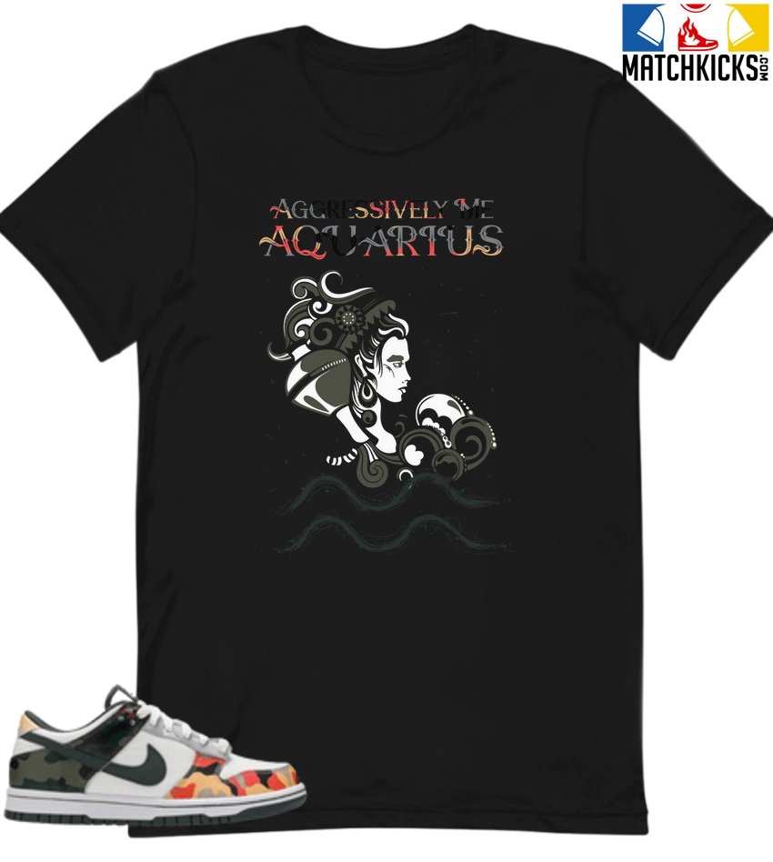 T-Shirt – Nike Dunk Low SE GS Sail Multi-Camo – Sneaker-Matching T-Shirt (Aquarius Aggressively Me) is a high quality sneaker-matching T-Shirt designed to match your Nike Dunk Low SE GS Sail Multi-Camo sneakers. – This Tee is designed with the exact colors to match with a premium look and feel. We only use the best materials and inks to produce our merchandise. All sizes are true to size.