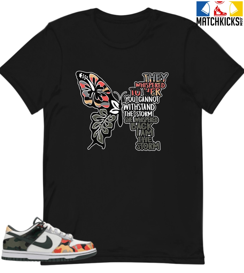 T-Shirt – Nike Dunk Low SE GS Sail Multi-Camo – Sneaker-Matching T-Shirt (Butterfly I AM the Storm) is a high quality sneaker-matching T-Shirt designed to match your Nike Dunk Low SE GS Sail Multi-Camo sneakers. – This Tee is designed with the exact colors to match with a premium look and feel. We only use the best materials and inks to produce our merchandise. All sizes are true to size.