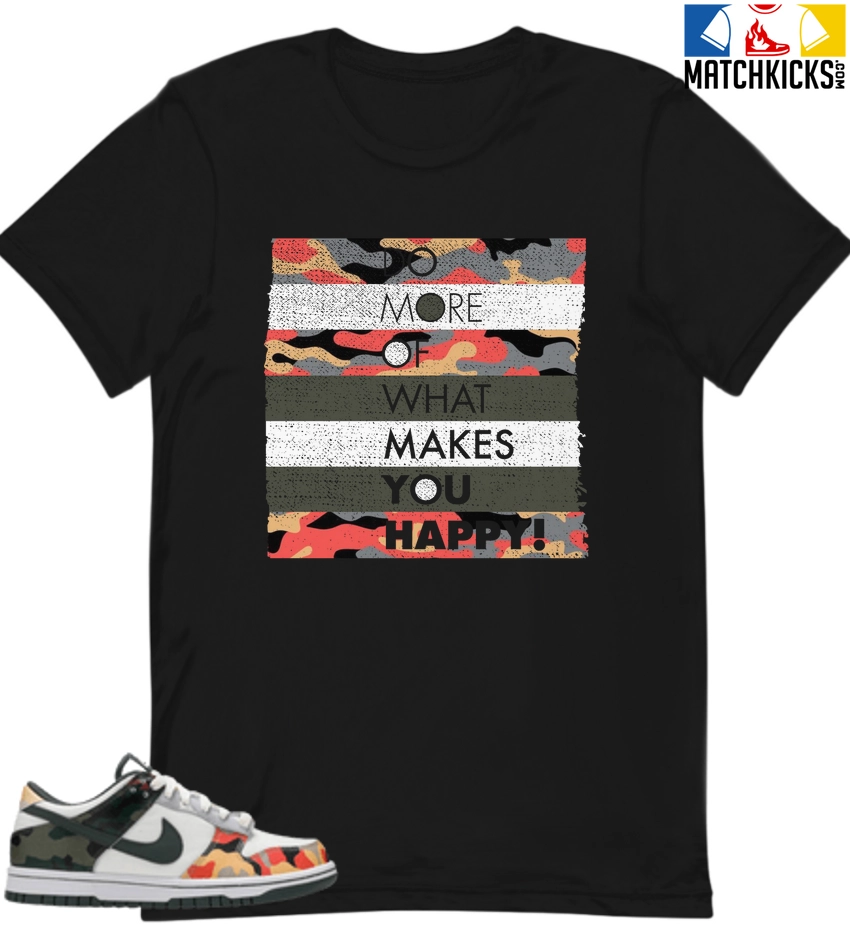 T-Shirt – Nike Dunk Low SE GS Sail Multi-Camo – Sneaker-Matching T-Shirt (Do More of What Makes You Happy) is a high quality sneaker-matching T-Shirt designed to match your Nike Dunk Low SE GS Sail Multi-Camo sneakers. – This Tee is designed with the exact colors to match with a premium look and feel. We only use the best materials and inks to produce our merchandise. All sizes are true to size.