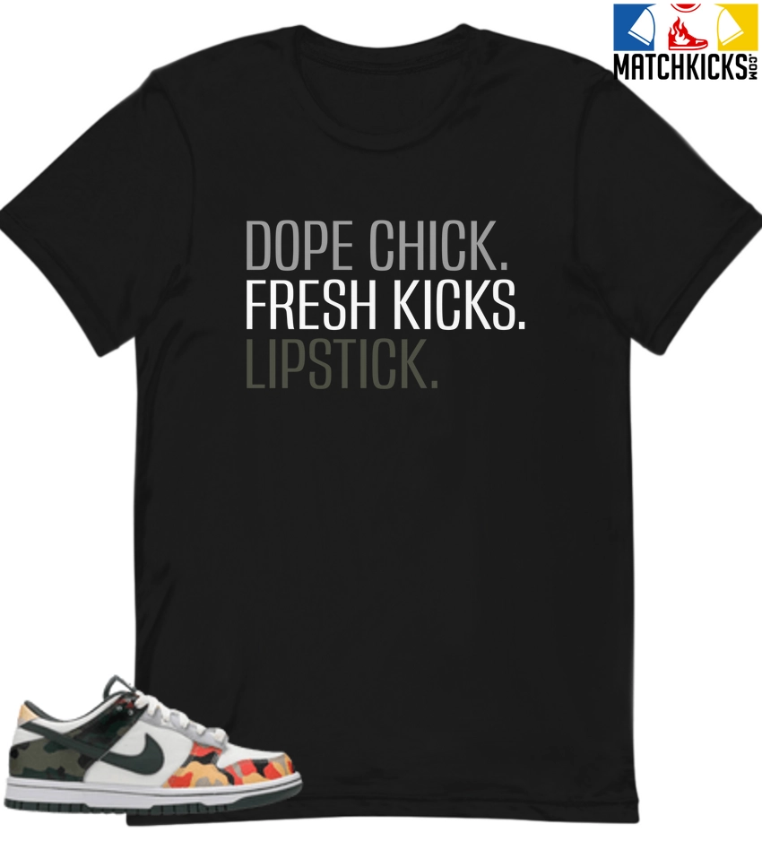 T-Shirt – Nike Dunk Low SE GS Sail Multi-Camo – Sneaker-Matching T-Shirt (Dope Chick) is a high quality sneaker-matching T-Shirt designed to match your Nike Dunk Low SE GS Sail Multi-Camo sneakers. – This Tee is designed with the exact colors to match with a premium look and feel. We only use the best materials and inks to produce our merchandise. All sizes are true to size.