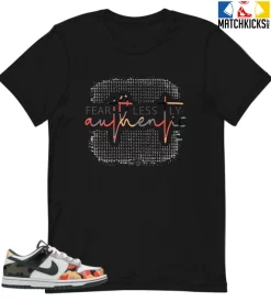 T-Shirt – Nike Dunk Low SE GS Sail Multi-Camo – Sneaker-Matching T-Shirt (Fearlessly Authentic) is a high quality sneaker-matching T-Shirt designed to match your Nike Dunk Low SE GS Sail Multi-Camo sneakers. – This Tee is designed with the exact colors to match with a premium look and feel. We only use the best materials and inks to produce our merchandise. All sizes are true to size.