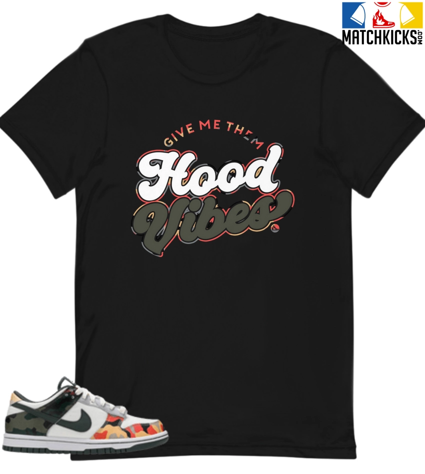 T-Shirt – Nike Dunk Low SE GS Sail Multi-Camo – Sneaker-Matching T-Shirt (Hood Vibes) is a high quality sneaker-matching T-Shirt designed to match your Nike Dunk Low SE GS Sail Multi-Camo sneakers. – This Tee is designed with the exact colors to match with a premium look and feel. We only use the best materials and inks to produce our merchandise. All sizes are true to size.