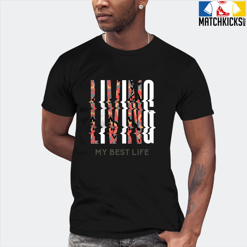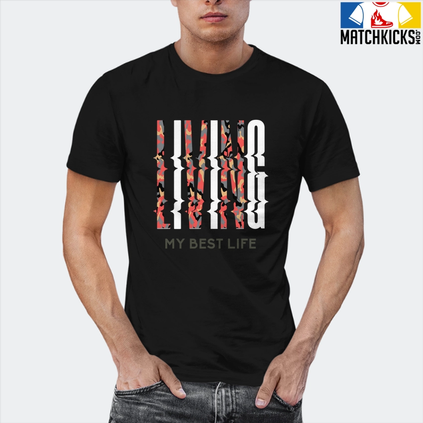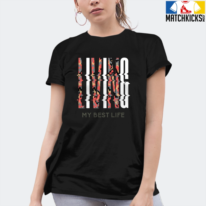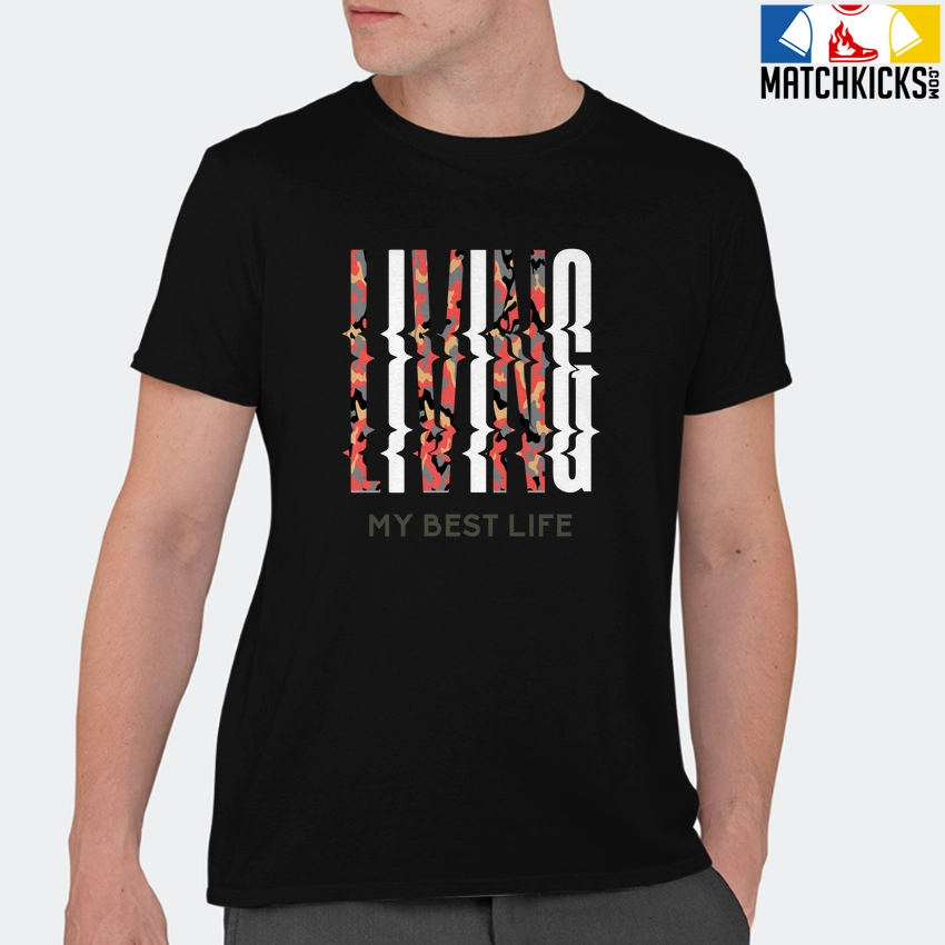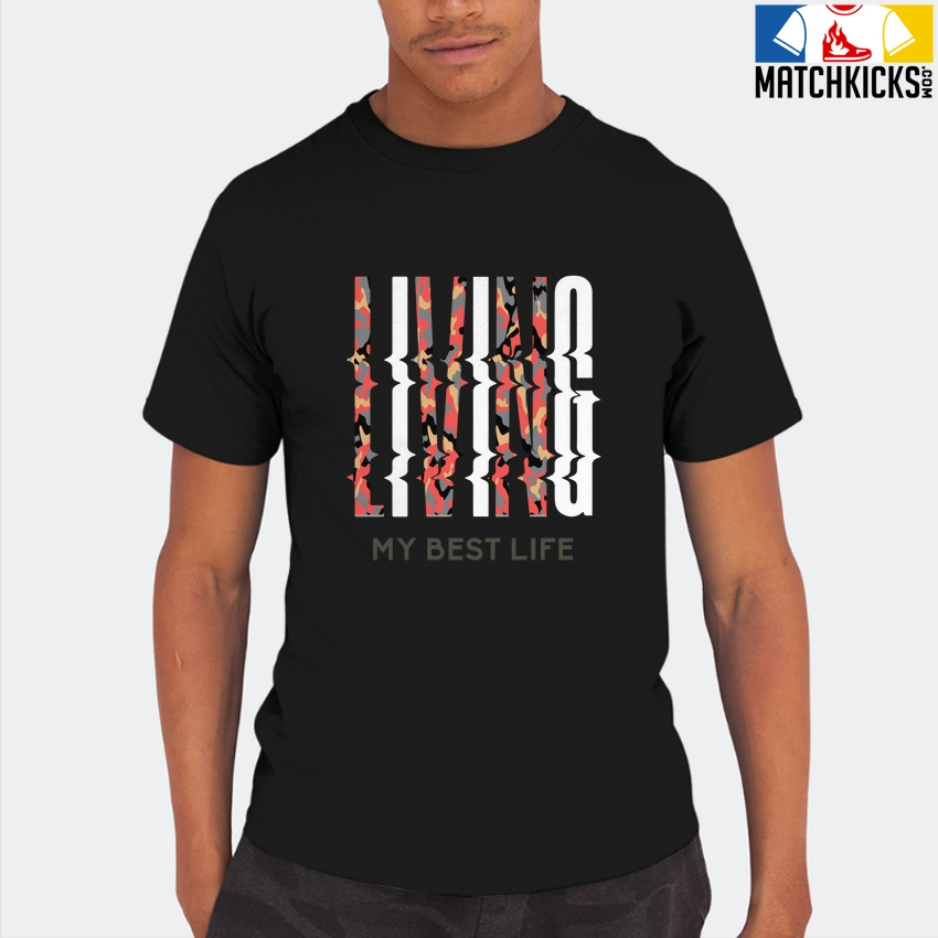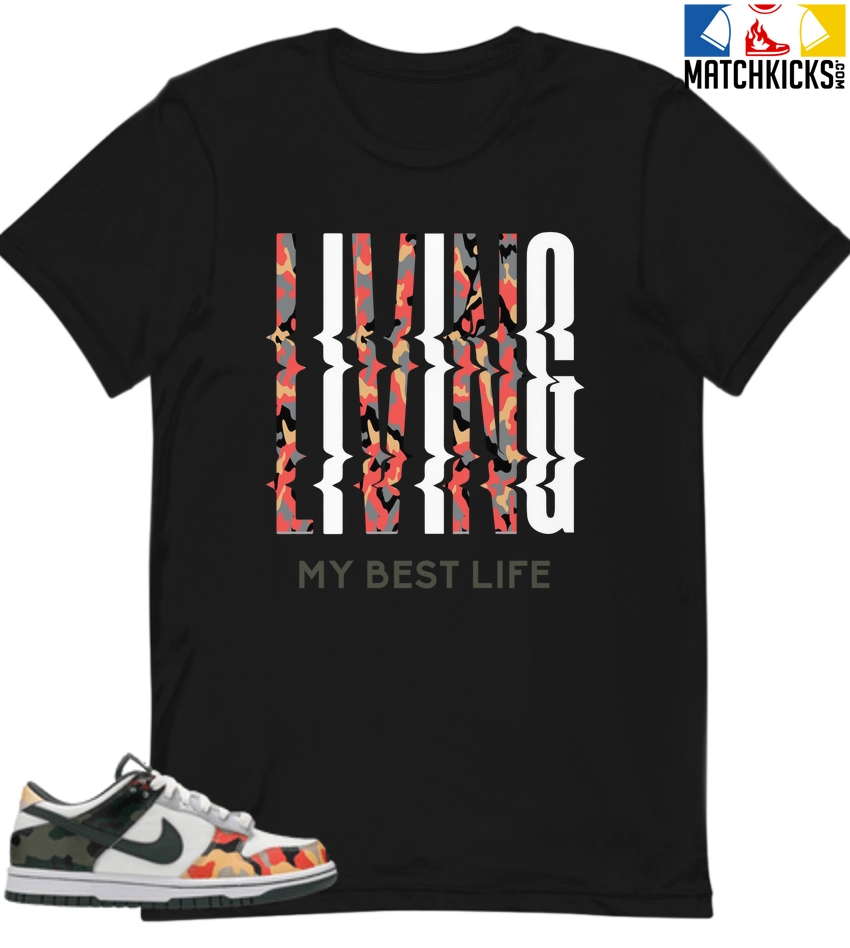 T-Shirt – Nike Dunk Low SE GS Sail Multi-Camo – Sneaker-Matching T-Shirt (LIVING MY BEST LIFE) is a high quality sneaker-matching T-Shirt designed to match your Nike Dunk Low SE GS Sail Multi-Camo sneakers. – This Tee is designed with the exact colors to match with a premium look and feel. We only use the best materials and inks to produce our merchandise. All sizes are true to size.