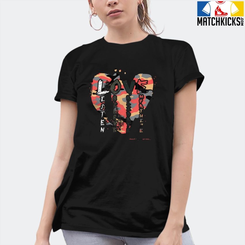 T-Shirt – Nike Dunk Low SE GS Sail Multi-Camo – Sneaker-Matching T-Shirt (LOVE Listen Observe Validate Empathize) is a high quality sneaker-matching T-Shirt designed to match your Nike Dunk Low SE GS Sail Multi-Camo sneakers. – This Tee is designed with the exact colors to match with a premium look and feel. We only use the best materials and inks to produce our merchandise. All sizes are true to size.