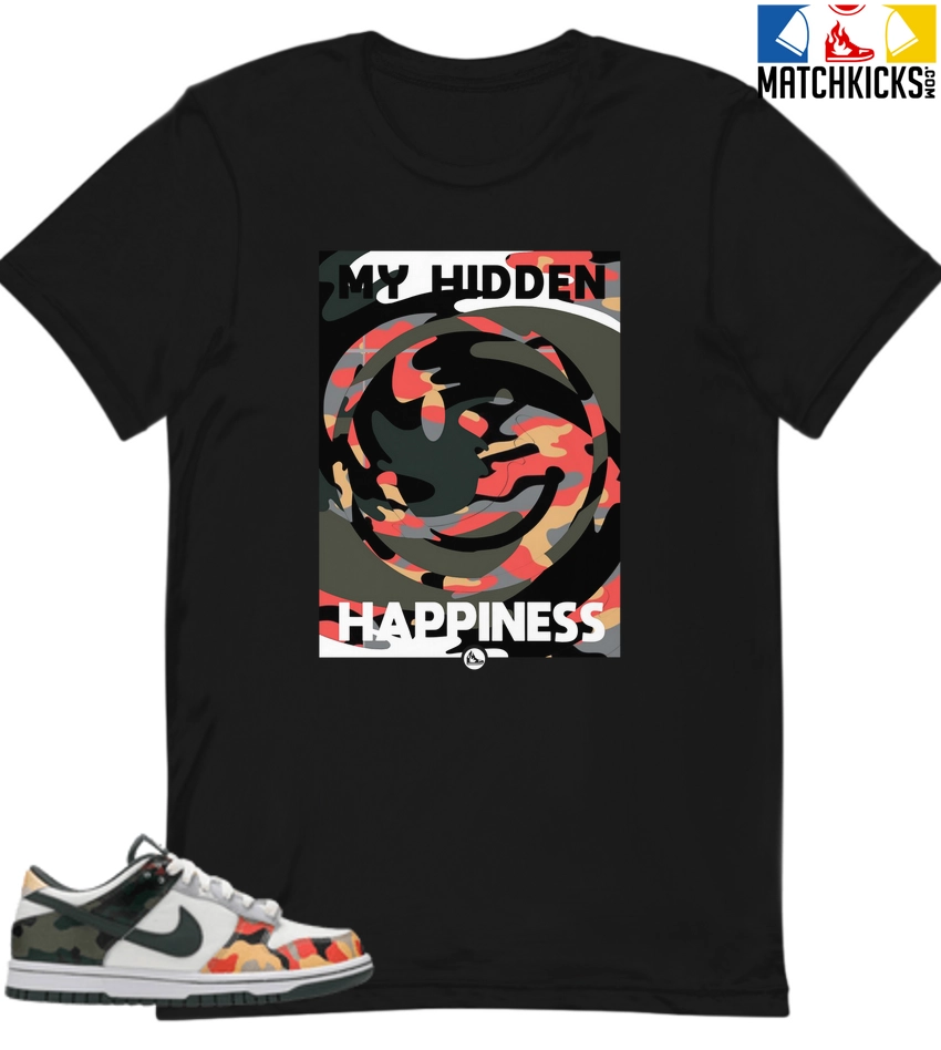T-Shirt – Nike Dunk Low SE GS Sail Multi-Camo – Sneaker-Matching T-Shirt (My Hidden Happiness) is a high quality sneaker-matching T-Shirt designed to match your Nike Dunk Low SE GS Sail Multi-Camo sneakers. – This Tee is designed with the exact colors to match with a premium look and feel. We only use the best materials and inks to produce our merchandise. All sizes are true to size.
