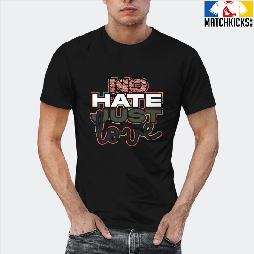 T-Shirt – Nike Dunk Low SE GS Sail Multi-Camo – Sneaker-Matching T-Shirt (No Hate Just Love) is a high quality sneaker-matching T-Shirt designed to match your Nike Dunk Low SE GS Sail Multi-Camo sneakers. – This Tee is designed with the exact colors to match with a premium look and feel. We only use the best materials and inks to produce our merchandise. All sizes are true to size.