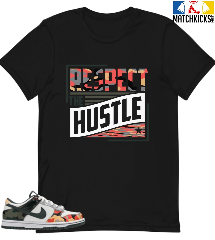 T-Shirt – Nike Dunk Low SE GS Sail Multi-Camo – Sneaker-Matching T-Shirt (RESPECT the HUSTLE) is a high quality sneaker-matching T-Shirt designed to match your Nike Dunk Low SE GS Sail Multi-Camo sneakers. – This Tee is designed with the exact colors to match with a premium look and feel. We only use the best materials and inks to produce our merchandise. All sizes are true to size.