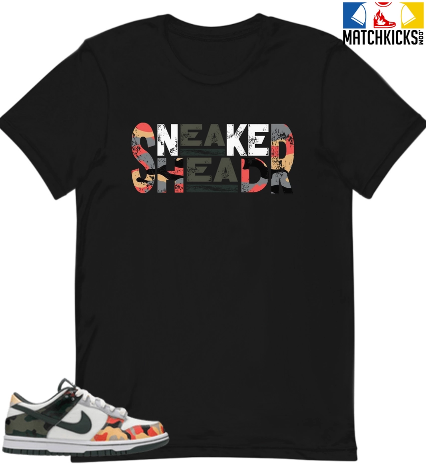 T-Shirt – Nike Dunk Low SE GS Sail Multi-Camo – Sneaker-Matching T-Shirt (SNEAKER HEAD) is a high quality sneaker-matching T-Shirt designed to match your Nike Dunk Low SE GS Sail Multi-Camo sneakers. – This Tee is designed with the exact colors to match with a premium look and feel. We only use the best materials and inks to produce our merchandise. All sizes are true to size.