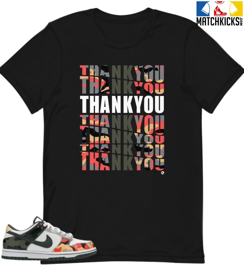 T-Shirt – Nike Dunk Low SE GS Sail Multi-Camo – Sneaker-Matching T-Shirt (Thank You) is a high quality sneaker-matching T-Shirt designed to match your Nike Dunk Low SE GS Sail Multi-Camo sneakers. – This Tee is designed with the exact colors to match with a premium look and feel. We only use the best materials and inks to produce our merchandise. All sizes are true to size.