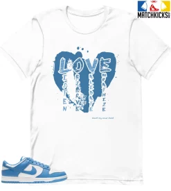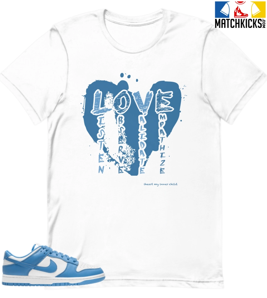T-Shirt – Nike Dunk Low University Blue – Sneaker-Matching T-Shirt (LOVE Listen Observe Validate Empathize) is a high quality sneaker-matching T-Shirt designed to match your Nike Dunk Low University Blue sneakers. – This Tee is designed with the exact colors to match with a premium look and feel. We only use the best materials and inks to produce our merchandise. All sizes are true to size.