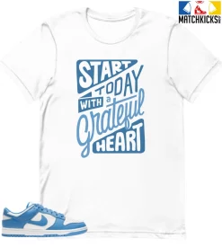 T-Shirt – Nike Dunk Low University Blue – Sneaker-Matching T-Shirt (Stay Grateful) is a high quality sneaker-matching T-Shirt designed to match your Nike Dunk Low University Blue sneakers. – This Tee is designed with the exact colors to match with a premium look and feel. We only use the best materials and inks to produce our merchandise. All sizes are true to size.