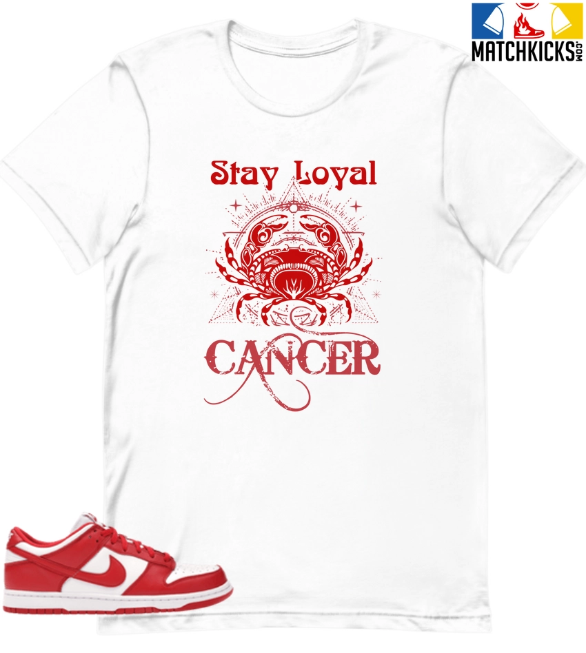 T-Shirt – Nike Dunk Low University Red (2020) – Sneaker-Matching T-Shirt (Cancer Stay Loyal) is a high quality sneaker-matching T-Shirt designed to match your Nike Dunk Low University Red (2020) sneakers. – This Tee is designed with the exact colors to match with a premium look and feel. We only use the best materials and inks to produce our merchandise. All sizes are true to size.