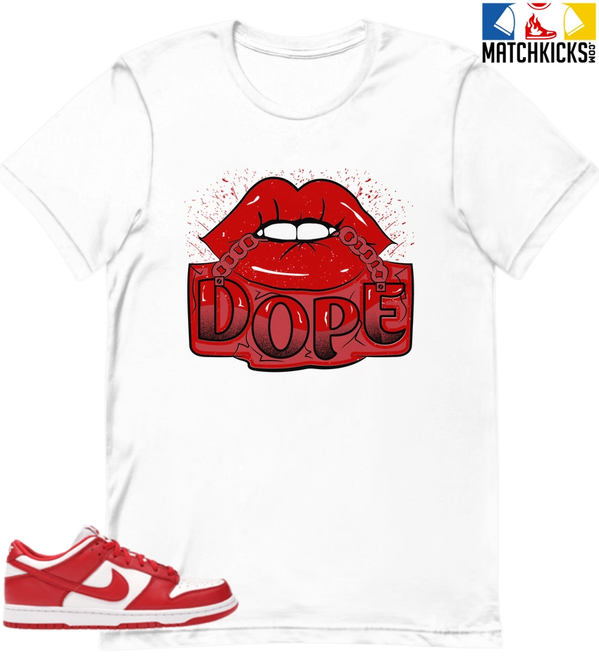 T-Shirt – Nike Dunk Low University Red (2020) – Sneaker-Matching T-Shirt (Dope Lips) is a high quality sneaker-matching T-Shirt designed to match your Nike Dunk Low University Red (2020) sneakers. – This Tee is designed with the exact colors to match with a premium look and feel. We only use the best materials and inks to produce our merchandise. All sizes are true to size.