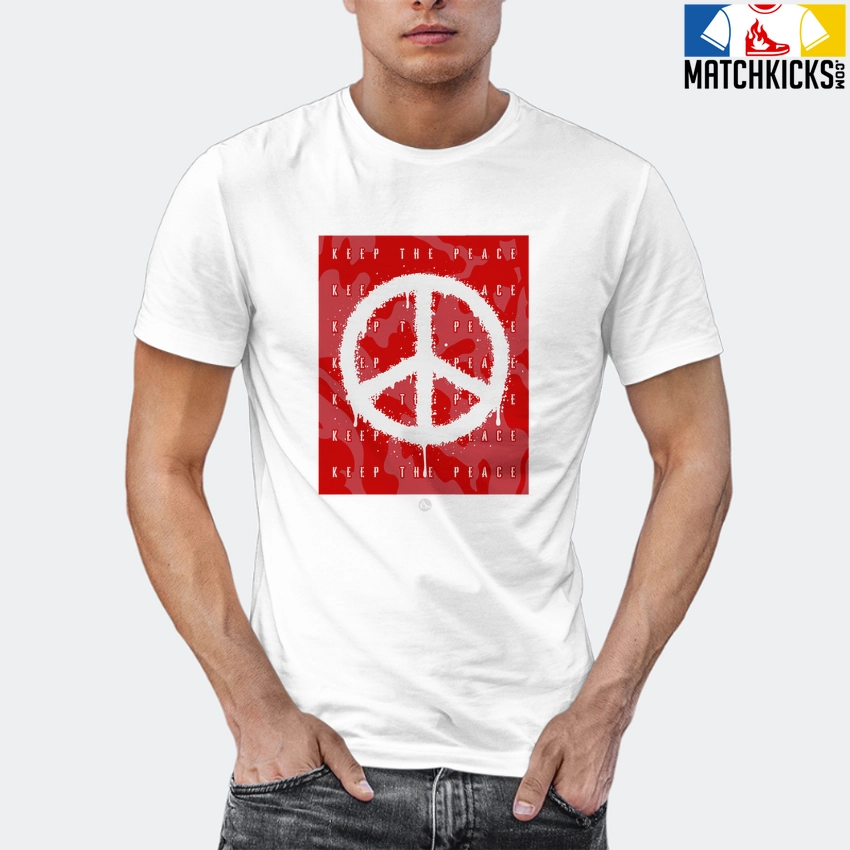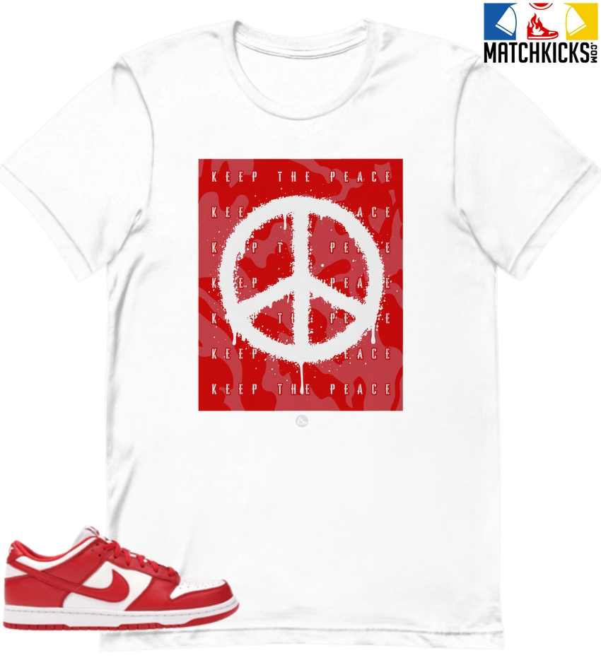 T-Shirt – Nike Dunk Low University Red (2020) – Sneaker-Matching T-Shirt (Keep the Peace) is a high quality sneaker-matching T-Shirt designed to match your Nike Dunk Low University Red (2020) sneakers. – This Tee is designed with the exact colors to match with a premium look and feel. We only use the best materials and inks to produce our merchandise. All sizes are true to size.