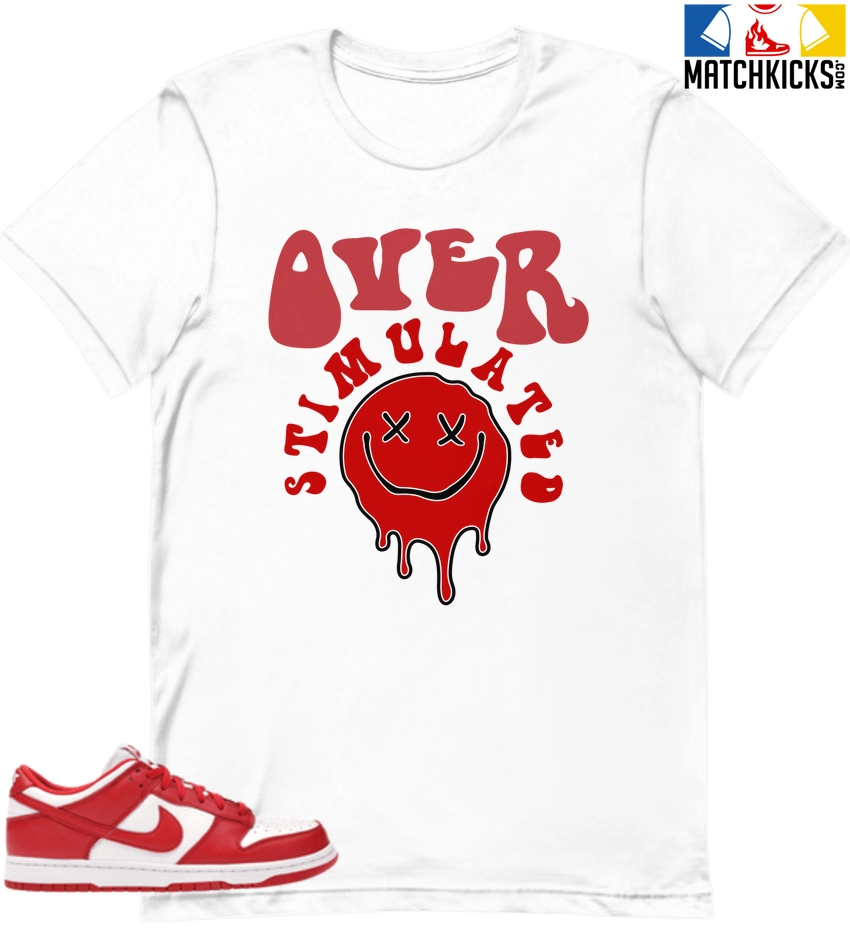 T-Shirt – Nike Dunk Low University Red (2020) – Sneaker-Matching T-Shirt (Over Stimulated) is a high quality sneaker-matching T-Shirt designed to match your Nike Dunk Low University Red (2020) sneakers. – This Tee is designed with the exact colors to match with a premium look and feel. We only use the best materials and inks to produce our merchandise. All sizes are true to size.