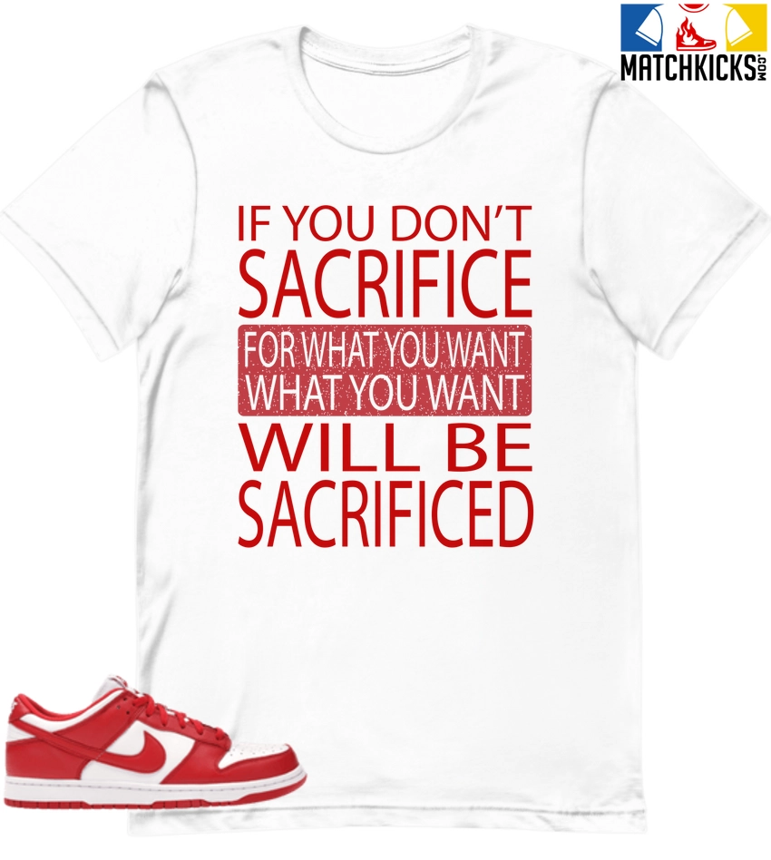 T-Shirt – Nike Dunk Low University Red (2020) – Sneaker-Matching T-Shirt (Sacrifice) is a high quality sneaker-matching T-Shirt designed to match your Nike Dunk Low University Red (2020) sneakers. – This Tee is designed with the exact colors to match with a premium look and feel. We only use the best materials and inks to produce our merchandise. All sizes are true to size.