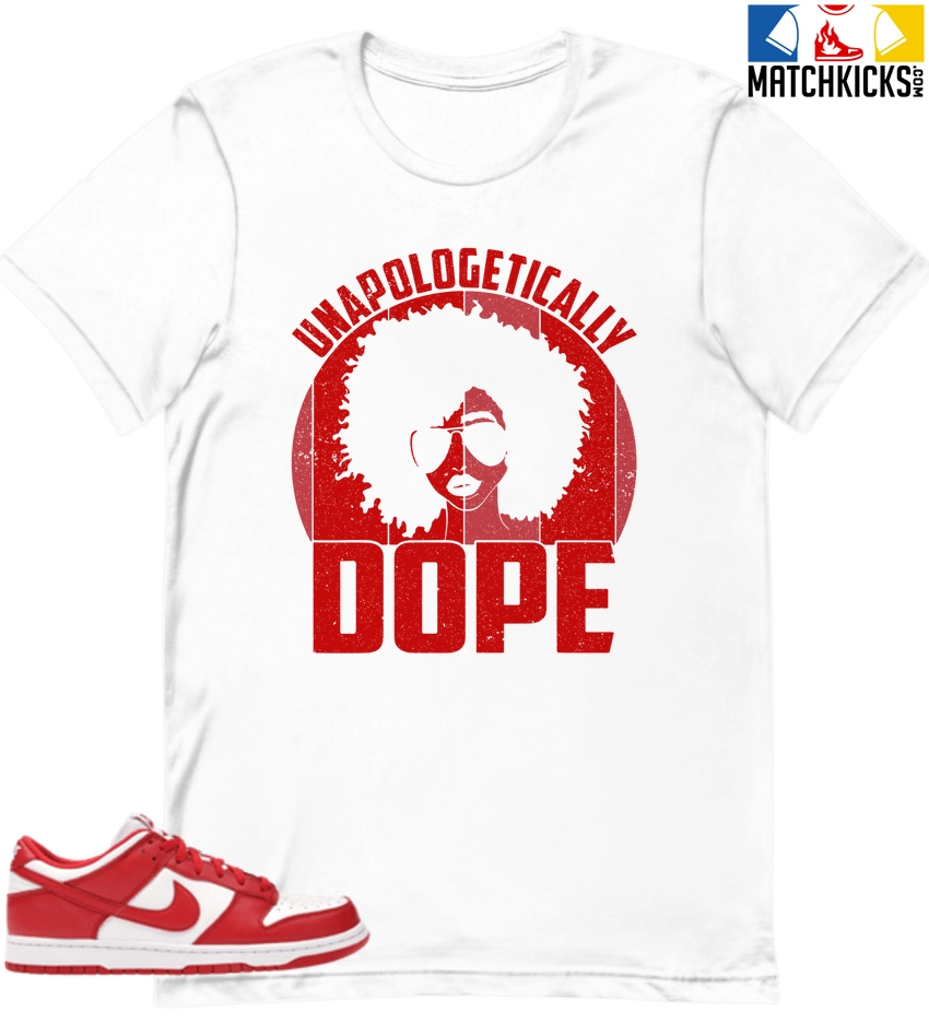 T-Shirt – Nike Dunk Low University Red (2020) – Sneaker-Matching T-Shirt (UNAPOLOGETICALLY DOPE) is a high quality sneaker-matching T-Shirt designed to match your Nike Dunk Low University Red (2020) sneakers. – This Tee is designed with the exact colors to match with a premium look and feel. We only use the best materials and inks to produce our merchandise. All sizes are true to size.