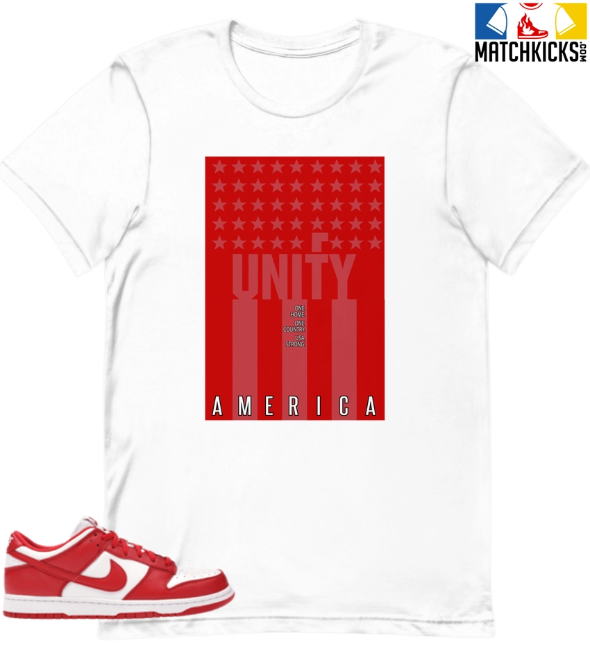 T-Shirt – Nike Dunk Low University Red (2020) – Sneaker-Matching T-Shirt (UNIFY AMERICA) is a high quality sneaker-matching T-Shirt designed to match your Nike Dunk Low University Red (2020) sneakers. – This Tee is designed with the exact colors to match with a premium look and feel. We only use the best materials and inks to produce our merchandise. All sizes are true to size.